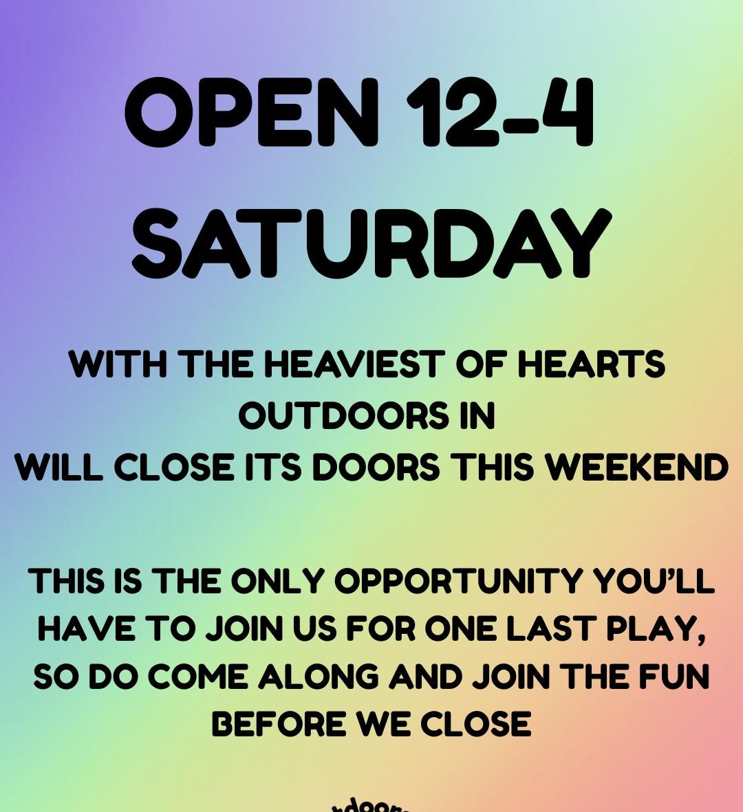 However all is not lost and you can still get your Outdoors IN fix one last time on Saturday afternoon between 12 & 4pm. Bookings are live on the website, please do come and support us one last time.